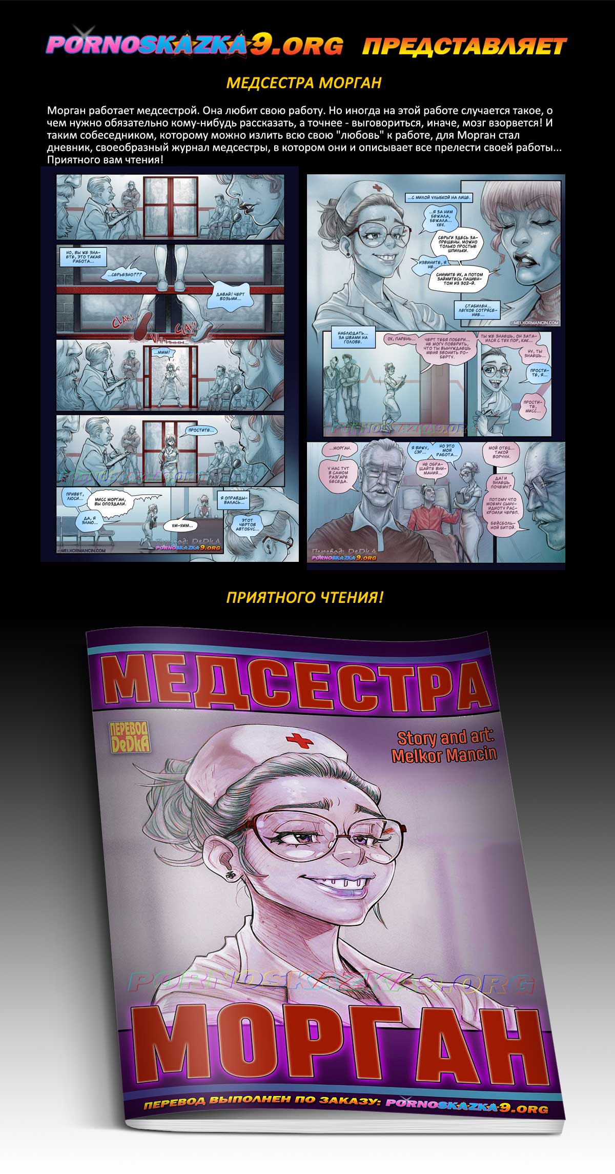 Порно комикс Медсестра Морган. Морган работает медсестрой. Она любит свою работу. Но иногда на этой работе случается такое, о чем нужно обязательно кому-нибудь рассказать, а точнее — выговориться, иначе, мозг взорвется! И таким собеседником, которому можно излить всю свою «любовь» к работе, для Морган стал дневник, своеобразный журнал медсестры, в котором они и описывает все прелести своей работы… Приятного вам чтения!